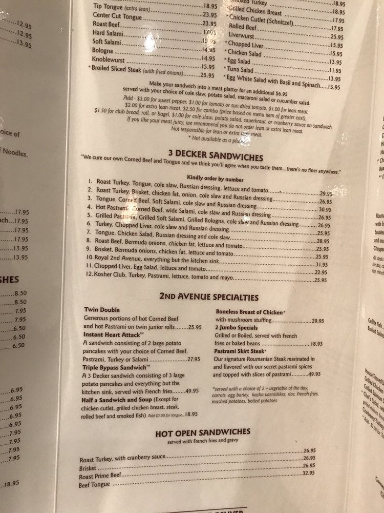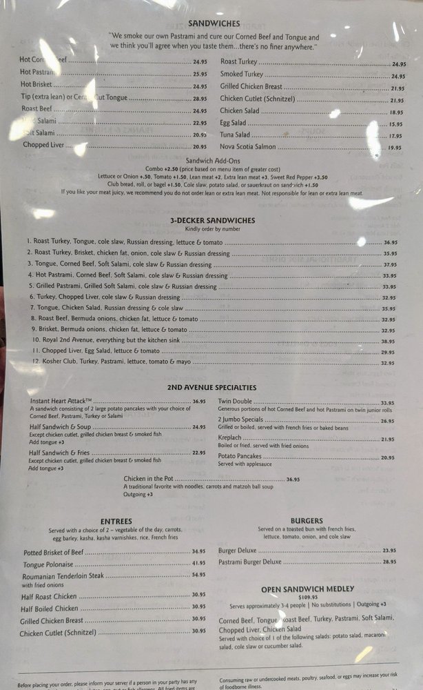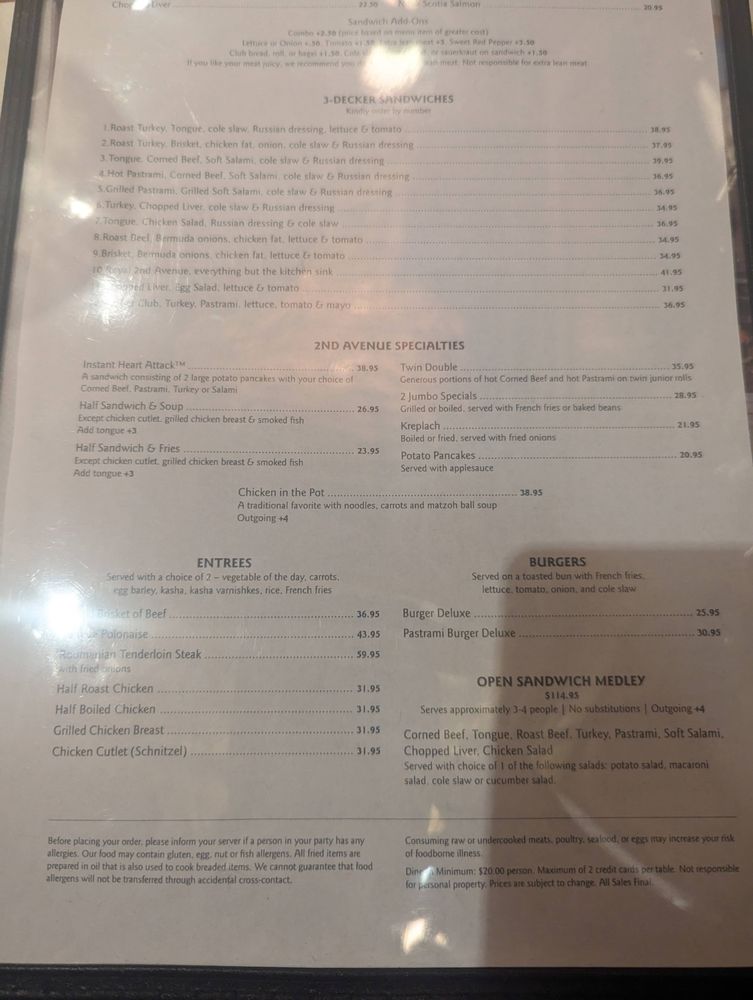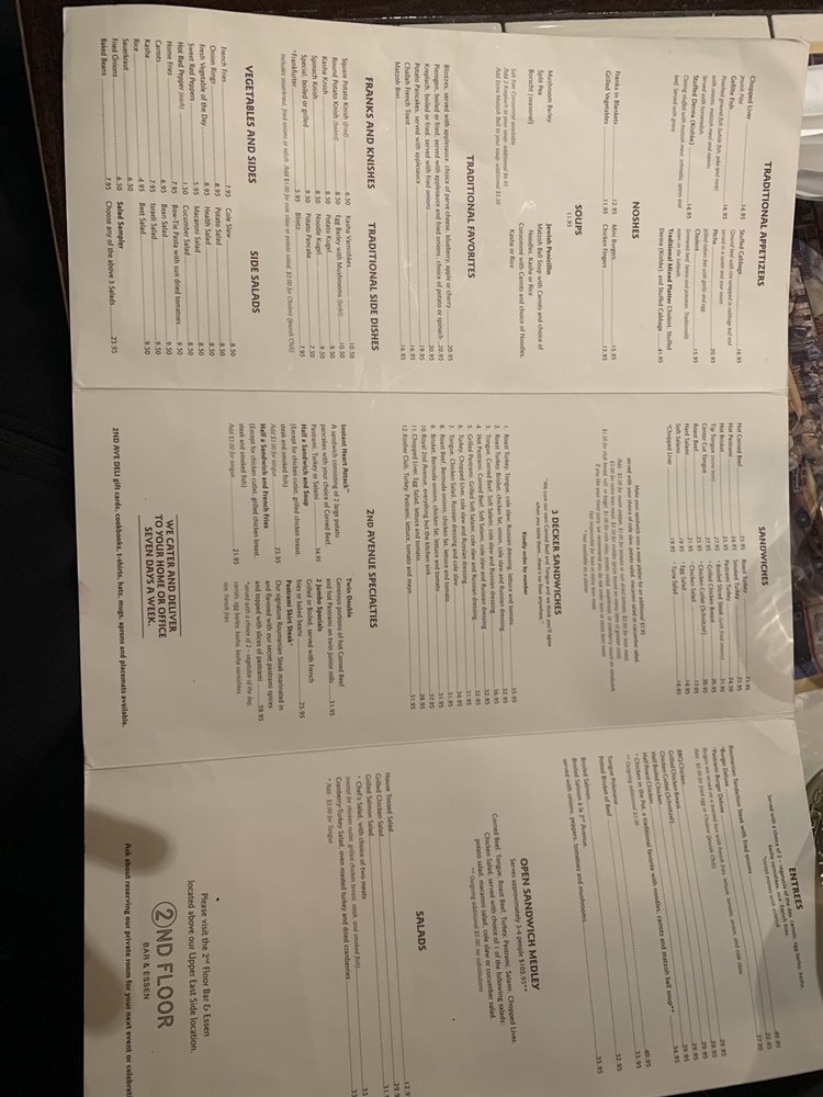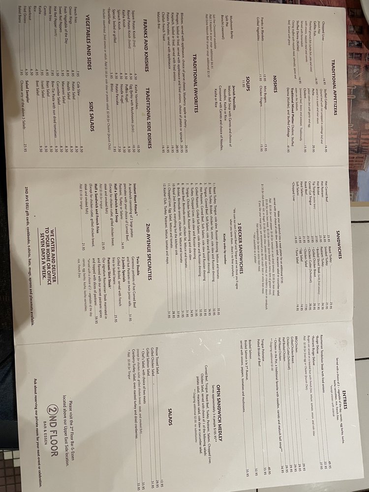 Introducing the menu at 2nd Ave Deli, a kosher restaurant known for its delicious sandwiches and traditional Jewish dishes. Located in New York, this deli offers delivery, takeout, and catering services. Customers rave about the pastrami, matzoh ball soup, and latkes. The menu includes classics like corned beef and cabbage for St. Patrick's Day and hamantaschen for Purim. Visitors appreciate the cozy atmosphere and attentive staff. With generous portion sizes and top-notch ingredients, 2nd Ave Deli is a must-visit for anyone craving authentic Jewish deli cuisine.